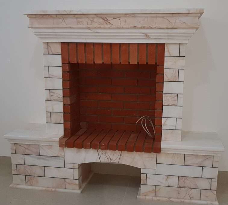 Cheminée CH11 sur mesure en marbre blanc veiné et briques réfractaires. Design classique et élégant, idéale pour salon luxe ou intérieur traditionnel. Finition artisanale, chaleur authentique et robustesse durable.